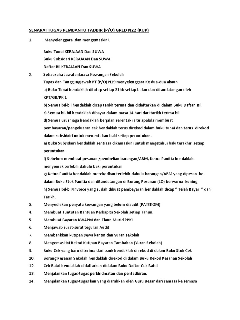 Maklumat lanjut syarat lantikan dan had umur perlantikan. Up to 3 cash back KEWANGAN 1 Menguruskan Pusat Tanggungjawab Sekolah. SENARAI TUGAS KAKITANGAN SOKONGAN KETUA PEMBANTU TADBIR N22 1.